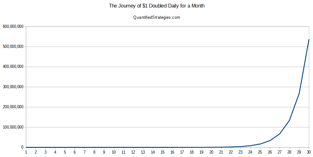 For example, let’s say you start with $1 and double it every day for a month. For the first day, you will have $1, the next day $2, then $4, then $8, and so on.