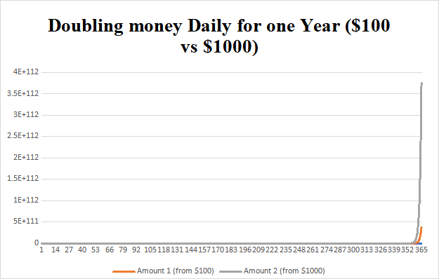 $100 vs. $1000 Doubles Daily for a year – Explanation