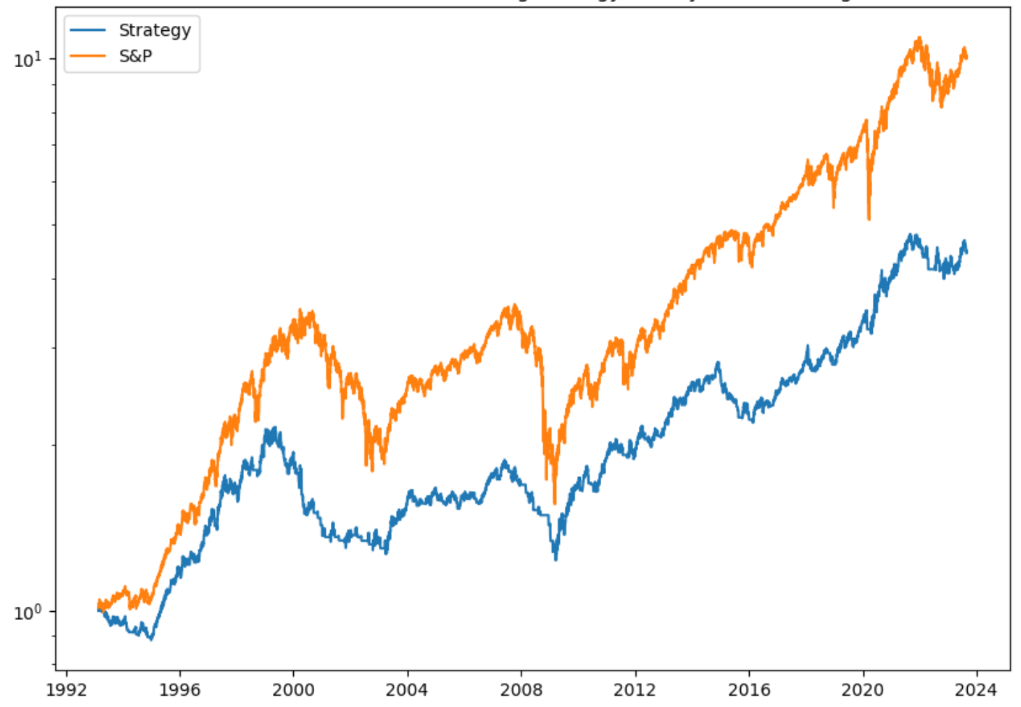 As you can see, the CAGR is very low despite being invested almost ~70% of the time. Moreover, the strategy experienced a significant drawdown, although not as high as buy and hold.