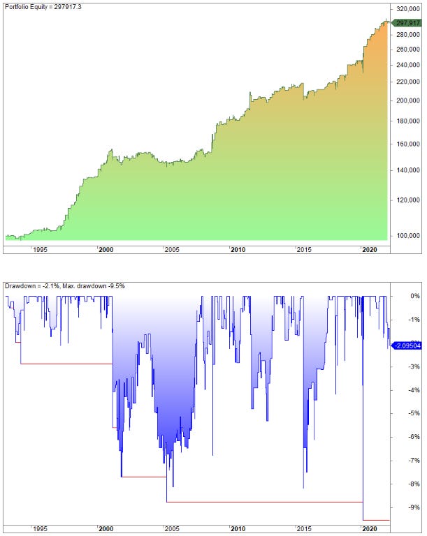 The main benefit of having trading strategies with such low exposure to the market is that the drawdown is lower. Big drawdowns are what make most traders quit at the wrong moments when the market turns around.