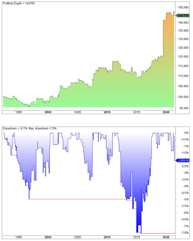 The main benefit of having trading strategies with such low exposure to the market is that the drawdown is lower. Big drawdowns are what make most traders quit at the wrong moments when the market turns around.