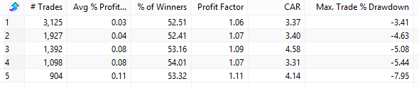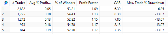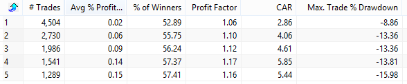 The first column indicates the return for the first trading day, number two the second trading day, etc. The average gain for any random trading day is 0.04%, so the results are not that promising: stocks perform slightly worse than a random day after a narrow range day.