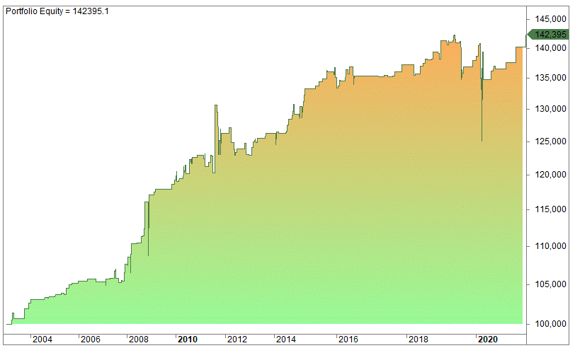 The equity curve shows 100 000 compounded from 2003 until June 2021. No commissions and slippage included.