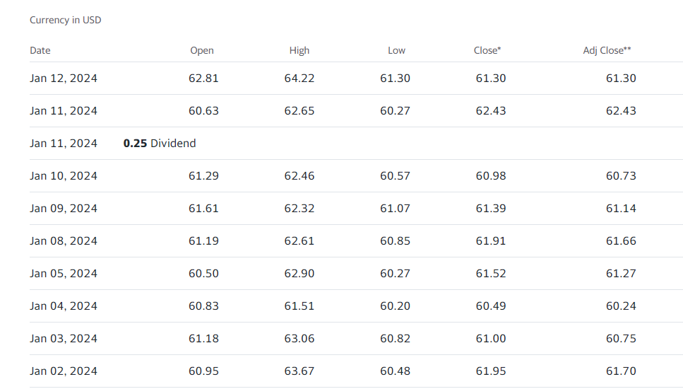 If we go back to January 16th 2018 we see that the close was 113.9, while the adjusted dividend close was 104.44. Todays price is 61.3, and thus the return is -52.6 dollars without dividends, and -43.14 with reinvested dividends (thus better).