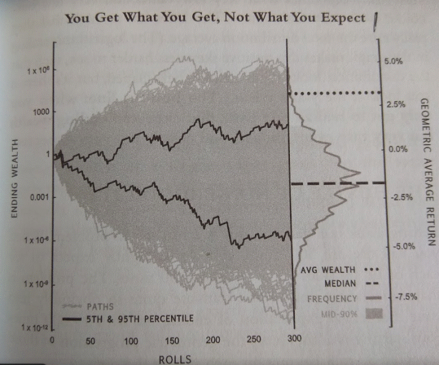 The problem in the real world is that you only get one path or sequence – not all of the 300 rolls. As Spitznagel writes in his book:
