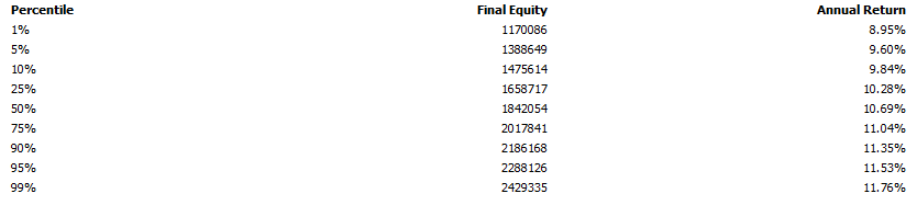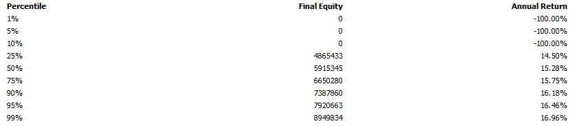 If we allocate 100% of our equity on each trade for this strategy, Amibroker gave the following results for a simulated Monte Carlo analysis: