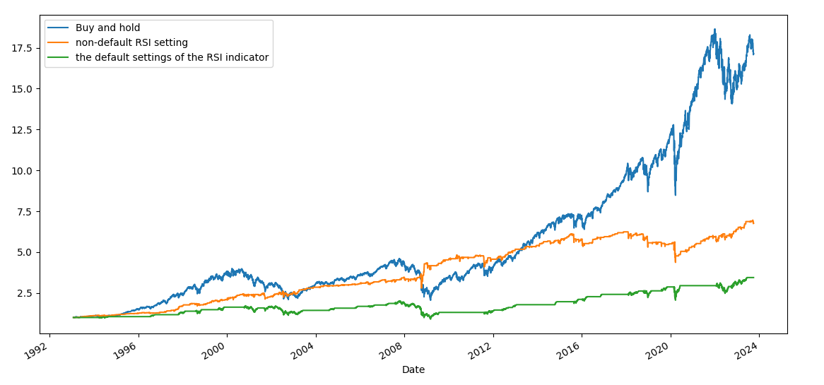 Well, one of the available options is to do backtesting in Python (or any other platform), and that is what we will do next. We will use the RSI with the non-default configuration and also the default configuration for comparison.