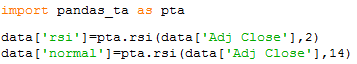 So to our data frame called data, we will add two new columns called ‘rsi’ and ‘normal’ which will be the RSI with the non-default and default settings, we will use the above mentioned formula to calculate the RSI in both cases.