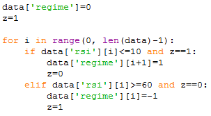 For the buy signal, the RSI must be below ten and z=1 (see z described below). For sell signal, RSI must be above 60 and z=0