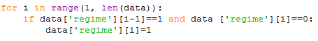 Now, to make it easier to calculate the returns, we are going to fill the regime columns between where the buy signals are generated and when the sell signals are activated with 1 (before this, the value in these rows was 0).