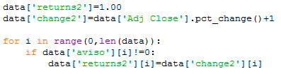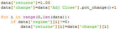 Then we will create another column called returns where if the regime value is not equal to zero we put the daily change of the SPY, if not we put only 1.