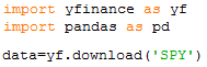 In our Python notebook, we can import the yfinance and pandas libraries to manipulate the data frame later. Then, we can define a variable and download the data frame of SPY historical prices using the yf.download() function of yfinance.