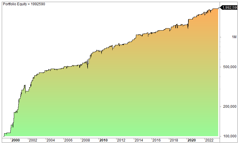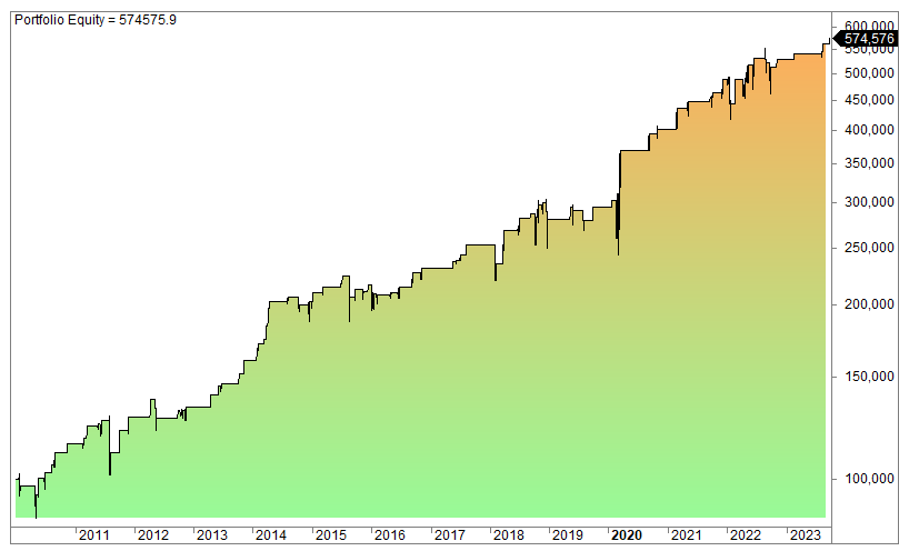 There are relatively few trades (181) but the average gain per trade is 1.7%, CAGR is 13% over the period (7.5% since 2010), and the win rate is 80%. You are only invested 10% of the time, thus the capital can accrue interest or be used for other trading strategies 90% of the time. Max drawdown is a modest 20%.