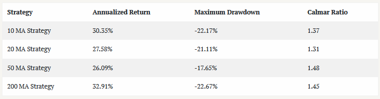 And how does the strategy perform when you incorporate a simple moving average? Here are the returns of the same strategy with an SMA filter (200-day moving average filter):