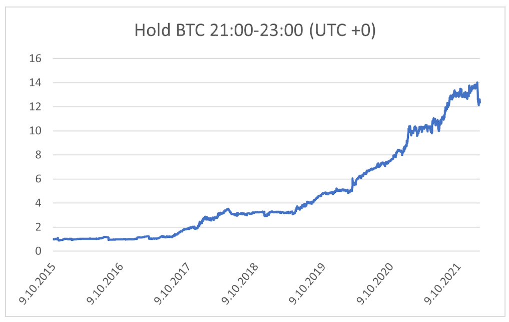 If, for example, you were to hold Bitcoin for just those two hours each day, here is what your equity curve would look like: