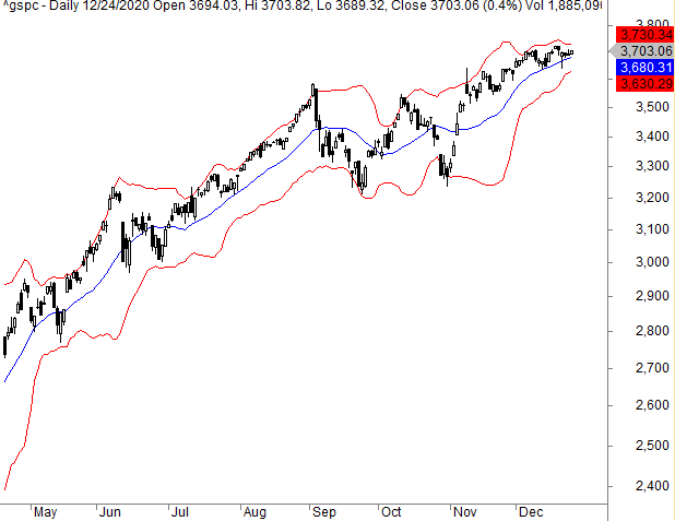 The above chart shows the 20-day simple moving average (the blue line), and the red lines above and below are added and subtracted 2 standard deviations from the moving average.
