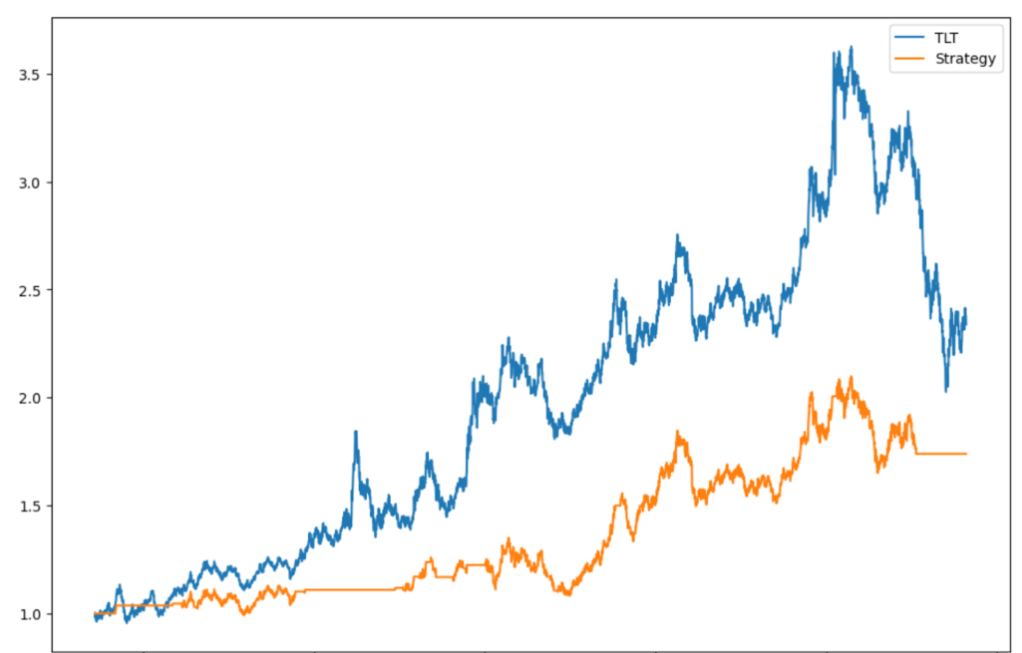 What would happen to the performance of TLT if we avoid periods of high volatility? In order to test this, we created a simple trading strategy with the following trading strategies: