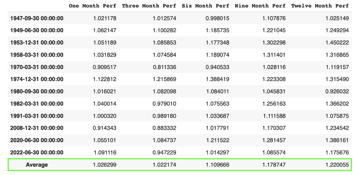 Here is the performance evaluation one, three, six, nine, and twelve months after the trading signal was triggered: