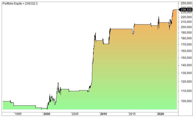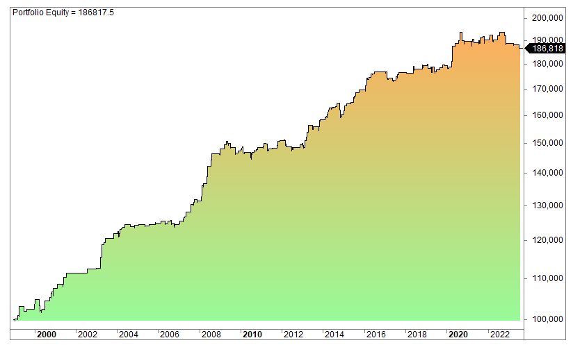 There are only 112 trades since its inception in 1993, but the average gain per trade is a pretty solid 0.72% and the win rate is 66%. But as expected, the return is pretty erratic because short is very difficult to trade. It doesn’t matter which asset you are looking at, short is almost much worse to trade than long.