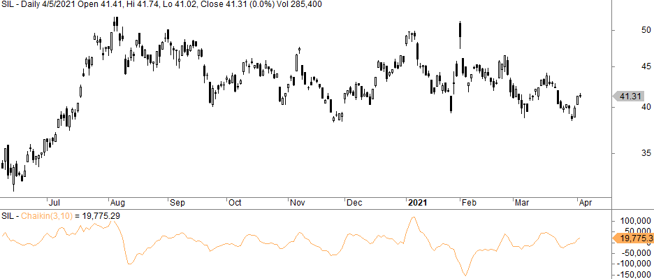 The formula above indicates the Chaikin Oscillator oscillates around zero. The short EMA shows the short-term momentum, while the long EMA shows a longer-term momentum. Below is an example of the indicator for silver miners (SIL) using the “standard” moving average values of 3 and 10: