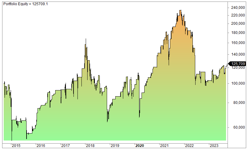 But let’s show you a channel trading strategy that works: It’s strategy #41 in our member shop. Because the strategy is behind a paywall, we don’t want to reveal its trading rules (obviously). But here’s the performance when we backtest SPY, the ETF that tracks S&P 500: