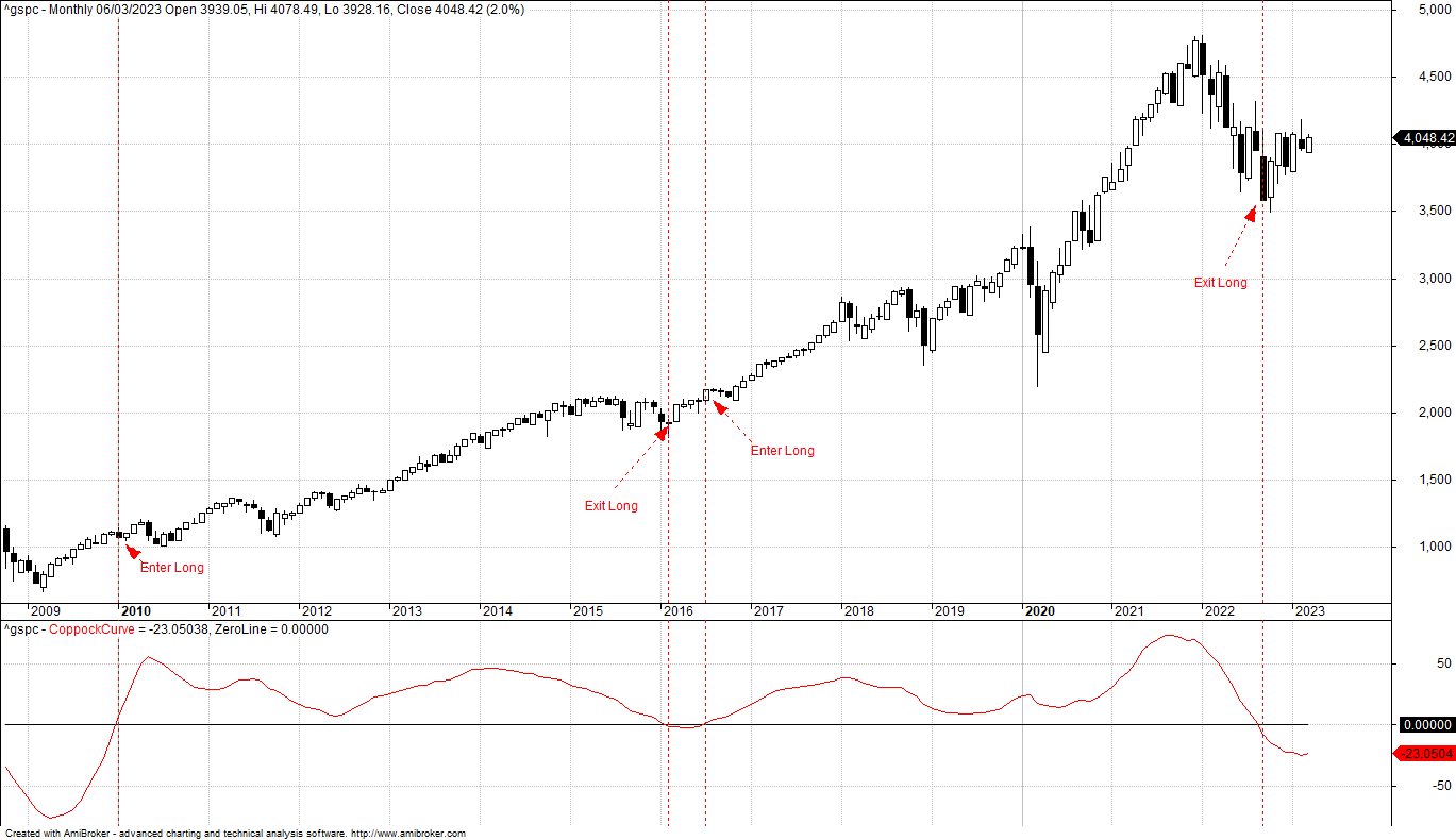The signals are thought to trigger a long entry trade when the Coppock curve crosses above the zero line and trigger an exit when the curve crosses below the zero line (from the upside).