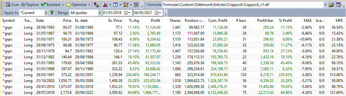 Let’s backtest the Coppock Curve strategy. We backtest the cash index of S&P 500 from 1960 until today. The trading rules are those stated above, and the chart below shows the equity curve with a start of 100 000 and compounding the profits. Dividends are not included in the simulation; thus, the results are somewhat understated.