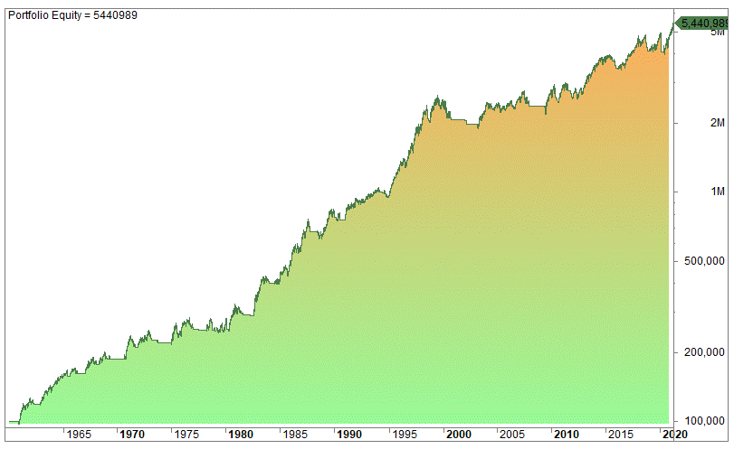 The logarithmic (linear vs logarithmic scale) equity curve above has a max drawdown of 28%, reached in 2002, and the CAGR is 6.73% while buy & hold is 7.16% (the test is not adjusted for dividends). S&P 500 trends little in the short term, but in the long term, the trend is up. Thus, such a simple system catches most of the gains in the stock market while limiting the losses along the way.