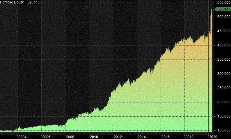 Assume we start with an account worth 100 000 and hold for one day and reinvest the profits. Below you find the accumulated profits from 2002 until early 2020: