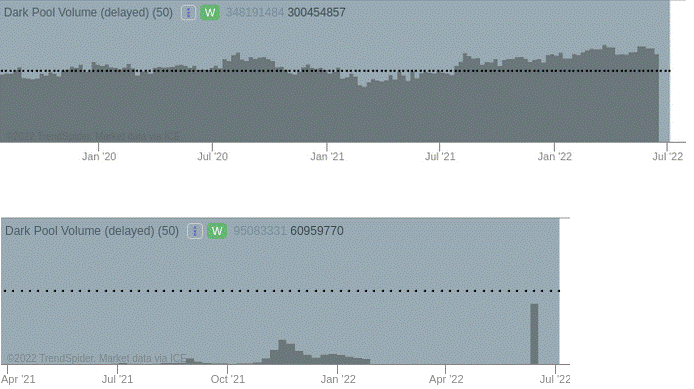 As mentioned, dark pools trading volume can be high, but it varies from stock to stock. The webpage Trendspider made some interesting charts to show the difference in dark pool trading volume. Here are two examples: