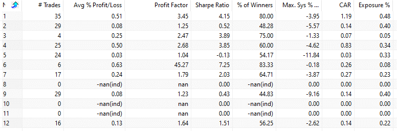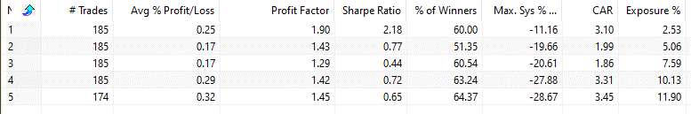 We use Amibroker’s optimization function and test be exiting by holding 1-5 days.