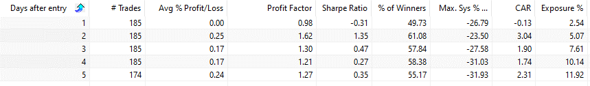 The first column shows when we exit the trade. The first row is one day and until the 5-day holding period. As you can see, holding over the holiday has produced no gains while the second day after the holiday has produced pretty good returns.