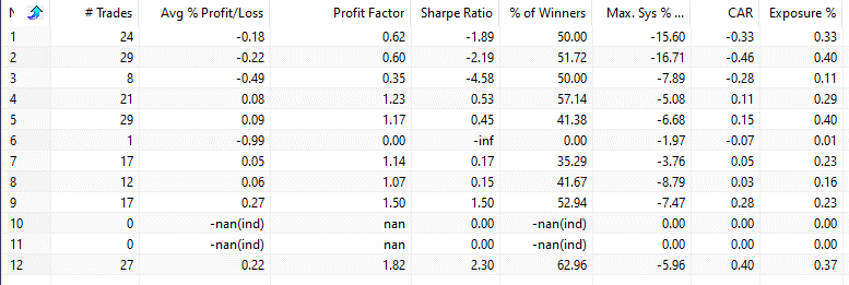 We use Amibroker’s optimization function and test be exiting by holding 1-5 days.