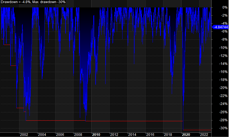 From 2000 till 2022, it offered a compounded annual growth return (CAGR) of 17.8 % with a maximum drawdown of 30.5 % while being invested 74.1 % of the time. The risk-adjusted return (RAR) is, therefore 24.1%.