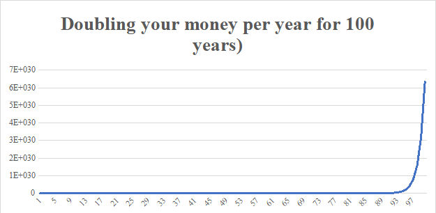 While doubling your money annually for a century is a completely unrealistic scenario in the real world, it shows a valuable lesson: the effect of compounding and snowballing your capital.