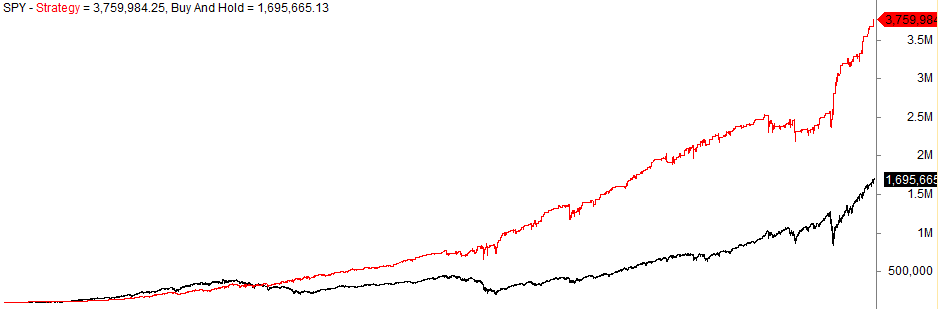 The graph has two lines: the black line shows the buy and hold of the S&P 500 (SPY) from 1993 until July 2021 (log scale), while the red line is a trading strategy part of our monthly Trading Edges. The dates are not included in the chart, but from 2000 until 2010, the S&P 500 had negative real returns while the strategy continued to perform well.