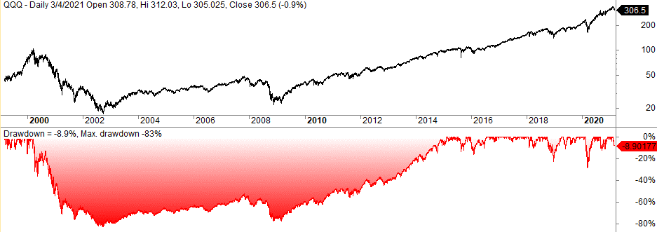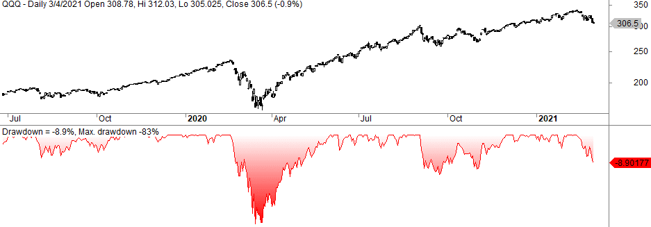 The drawdown above shows, for example, that the QQQ set a new high in late February 2020 before it fell to a drawdown of 27% in March. However, it quickly set a new high again in June.