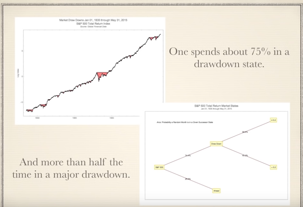 As Frey pointed out, drawdowns are one constant thing in the market over the years. According to him, investors at any point in time are at a 75% chance of being in a drawdown state. In other words, one spends about 75% in a drawdown, and what is mindboggling is that more than half of that time is spent in a major drawdown, which he defined as a more than 20% drawdown.
