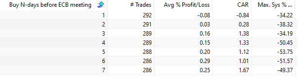 Let’s start by looking at the performance N-days before the ECB meeting ends (the last day of the meeting) and sell at the close of the day of the meeting.
