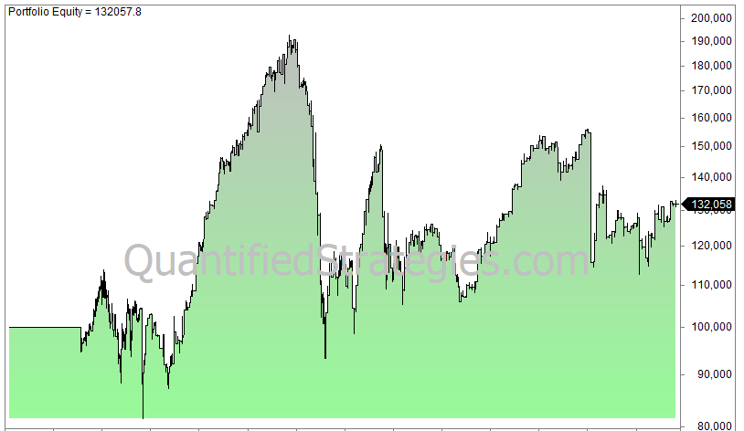 The table shows a pretty bleak performance. Below is the equity curve for holding the position for four trading days: