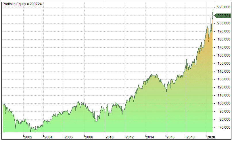 100 000 invested at the start of the year 2000 compounds to 209 000 by mid-2020, a CAGR of 3.6%. The strategy is invested 59% of the time. This compares to the “buy and hold” of 6.25% annually. The profit factor is a modest 1.5.