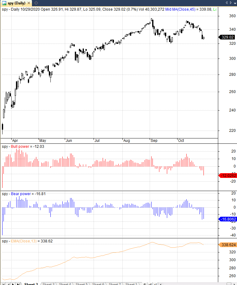 Alexander Elder recommends selling when bulls start losing power. This is of course gibberish and quite typical of “gurus”. In the above example, we used the signal for short as a sell criterion.