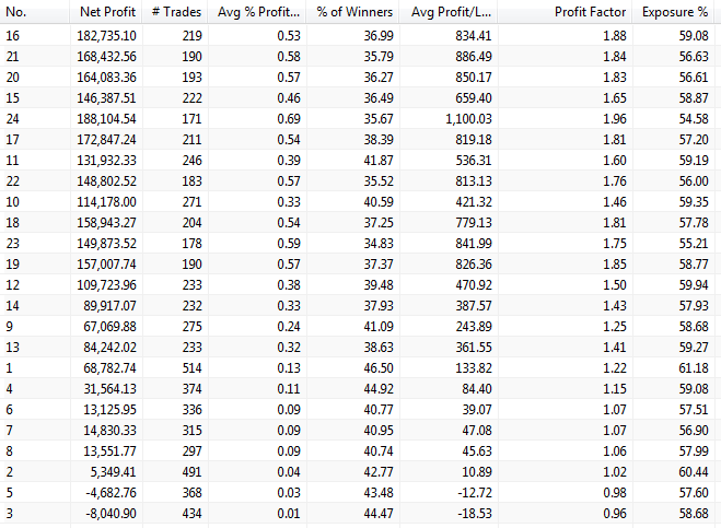 The first column is the number of days in the EMA. For example, the first row says that 16 days EMA performs the best. In general, the indicator is better the higher the number we use in the EMA.