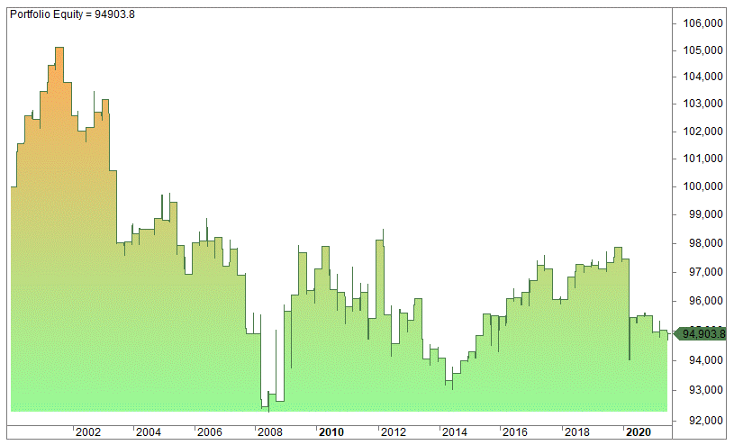 We test the futures contracts – not the cash index – and we use a 100% margin. 100 000 is invested in March 2000 and reinvested into the next quarterly futures expiration week. Thus, there are four trades a year.