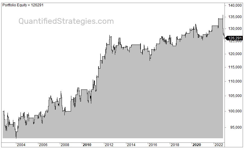 Yes, we added a momentum filter, and the number of trades went down to 126, but we doubled the average gain per trade. We got the following equity curve: