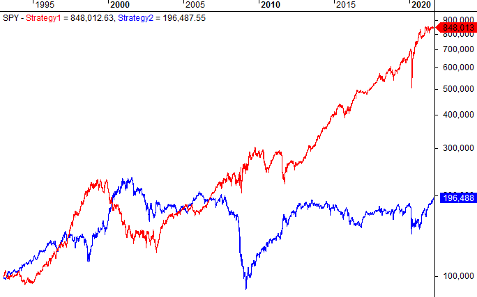 If we invest 100 000 into each strategy in 1993 and let it compound until September 2021 we get these two equity curves: