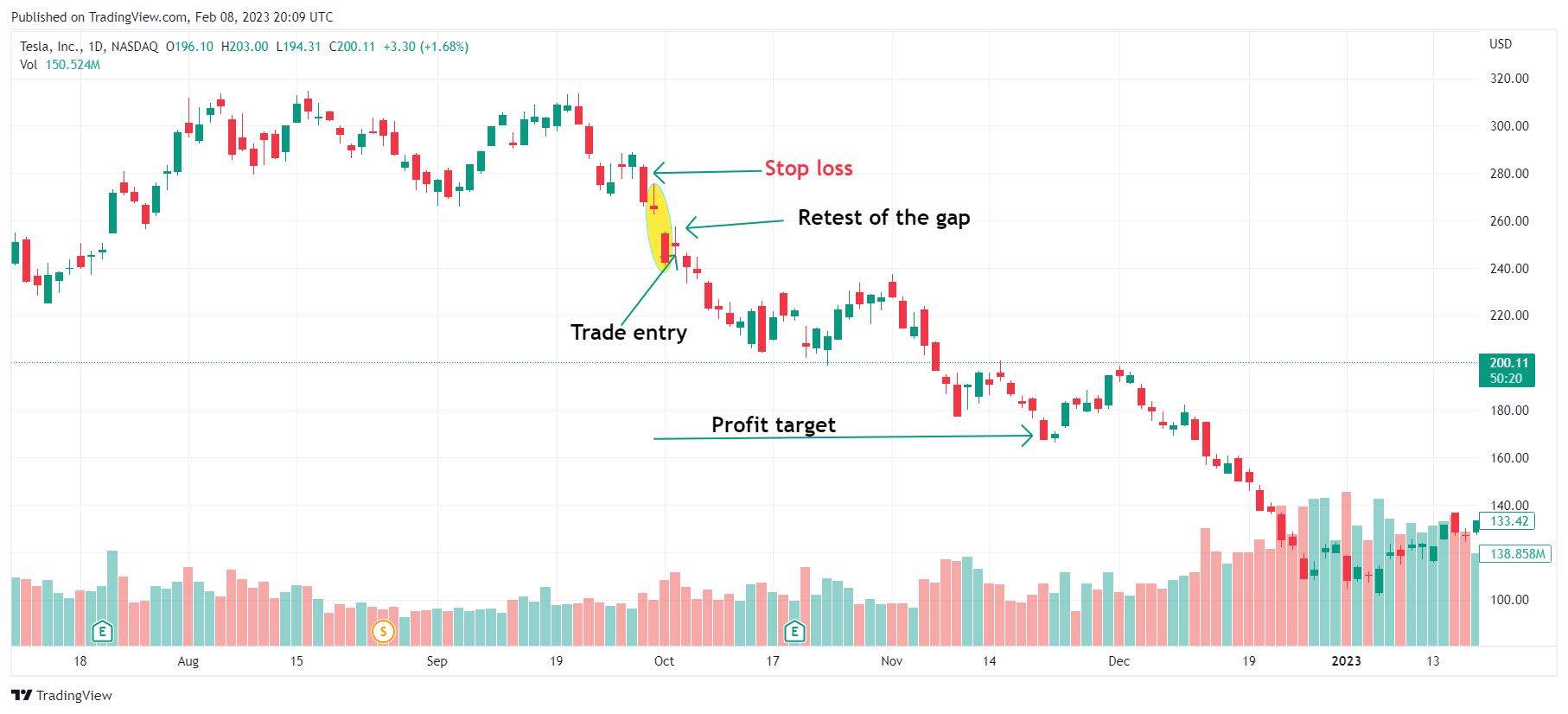 - Retest and confirmation: It may be wise to wait for the price to rise to the gap and get resisted. The retest of the gap and the subsequent rejection help to confirm the pattern and signal the continuation of the downward trend. However, the retest may not be present all the time.