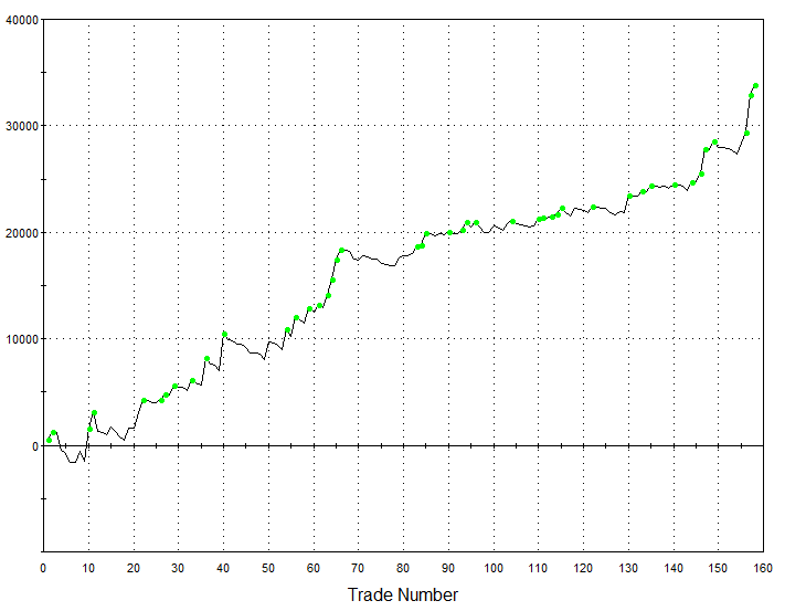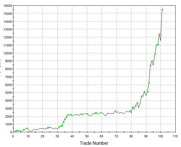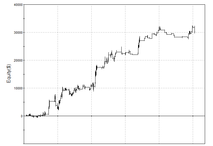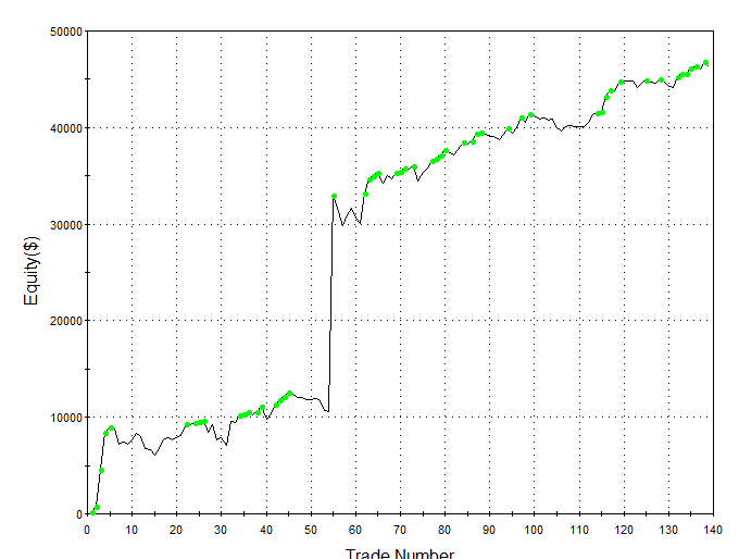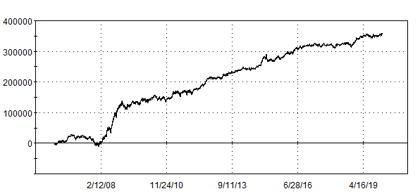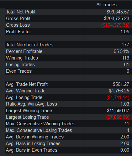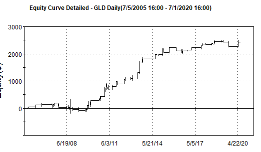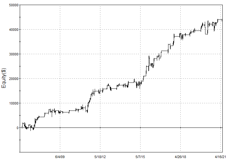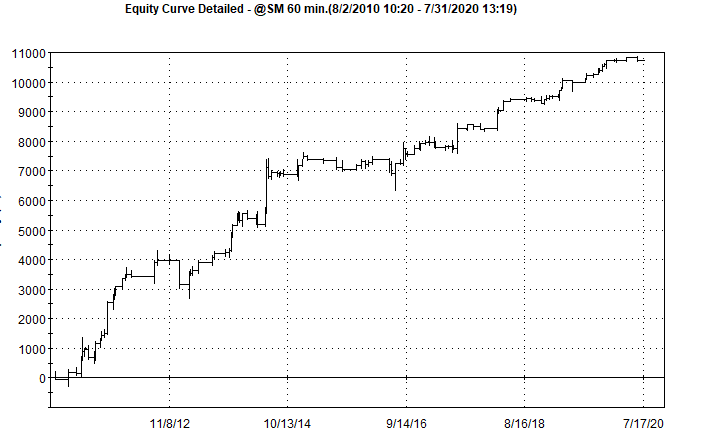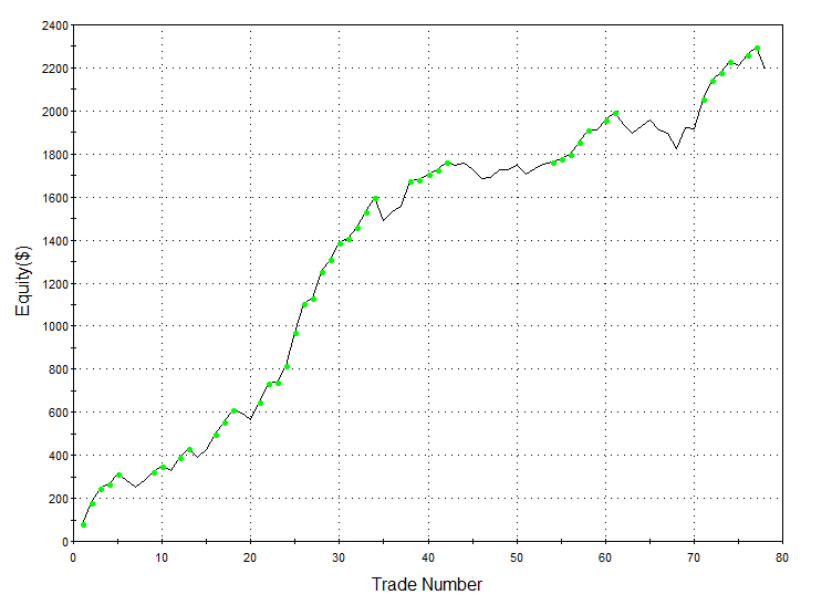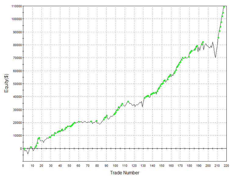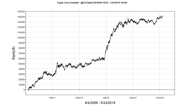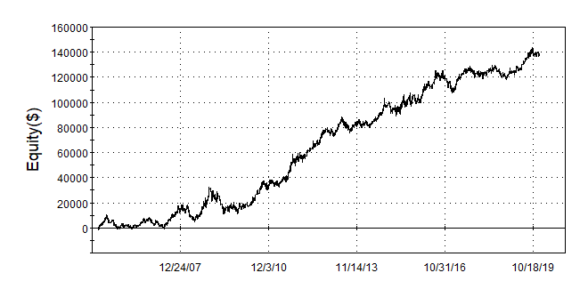 The backtest trades at the close, is based on daily bars, and is from the contract’s inception until today. The strategy can also be traded on tomorrow’s open, but performs slightly worse with this setting.