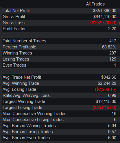 The strategy works best for @ES.D and is a mean reversion strategy.
