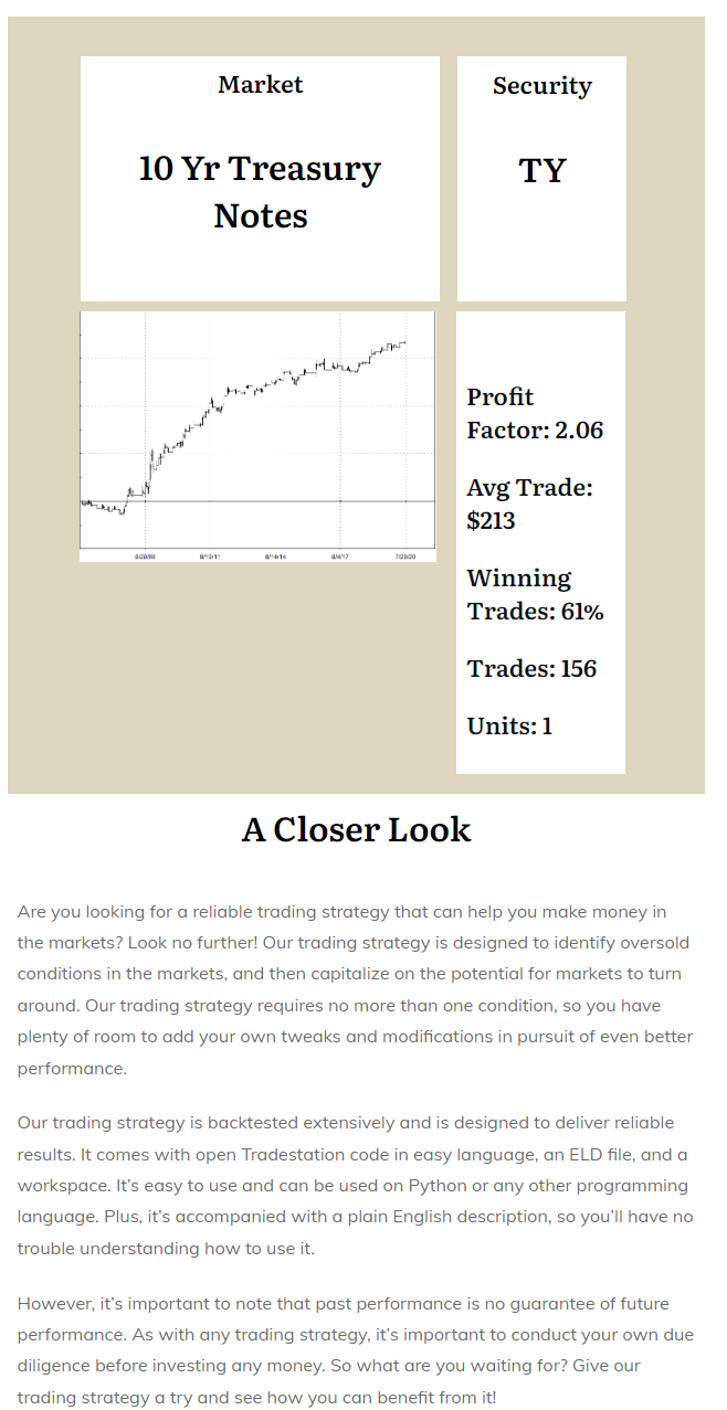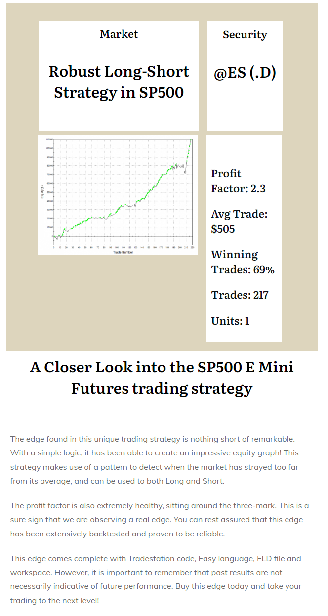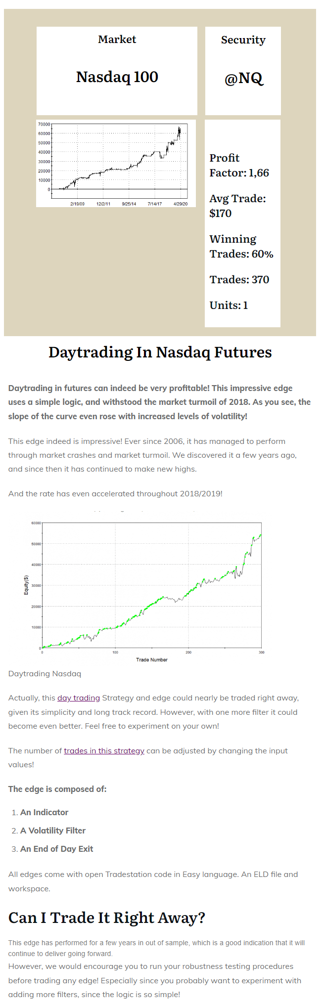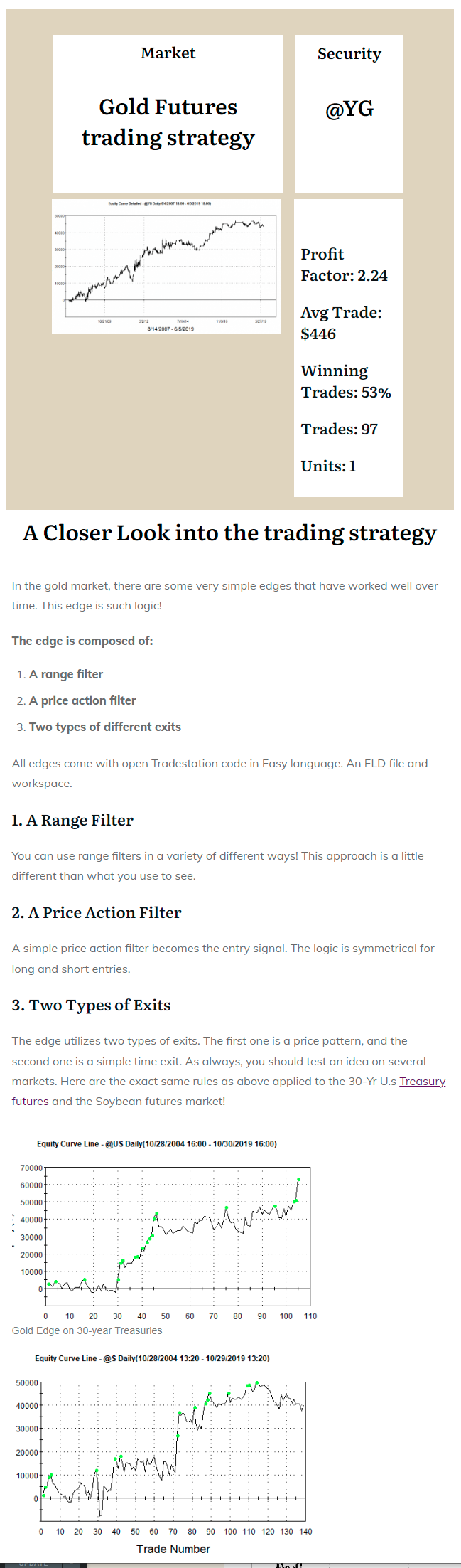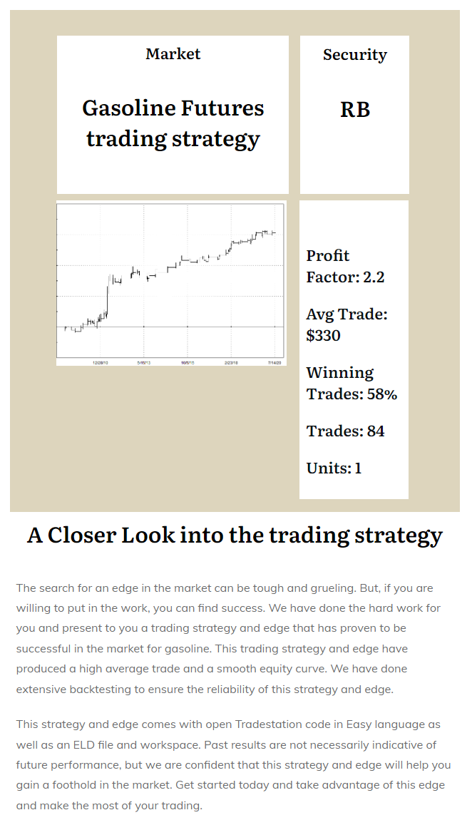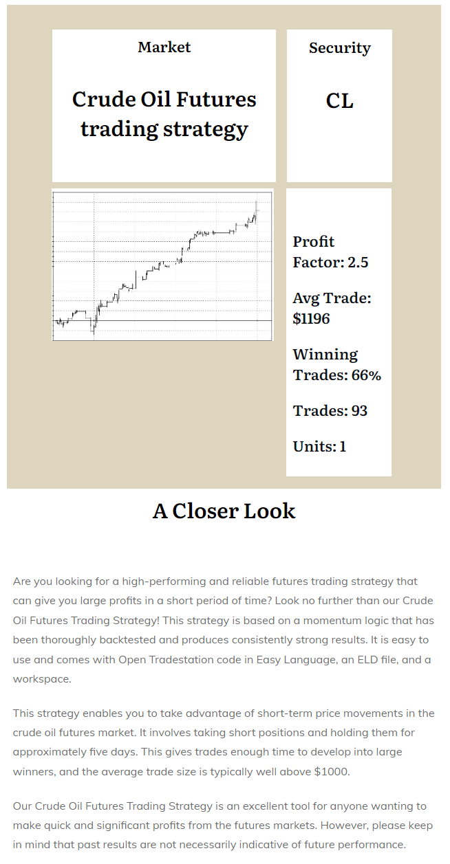 Each Futures Trading Strategy comes with trading rules in plain English and strategy code for Tradestation/Easy Language (others on demand). Commissions and slippage are not included in the backtests (estimated commissions and slippage).